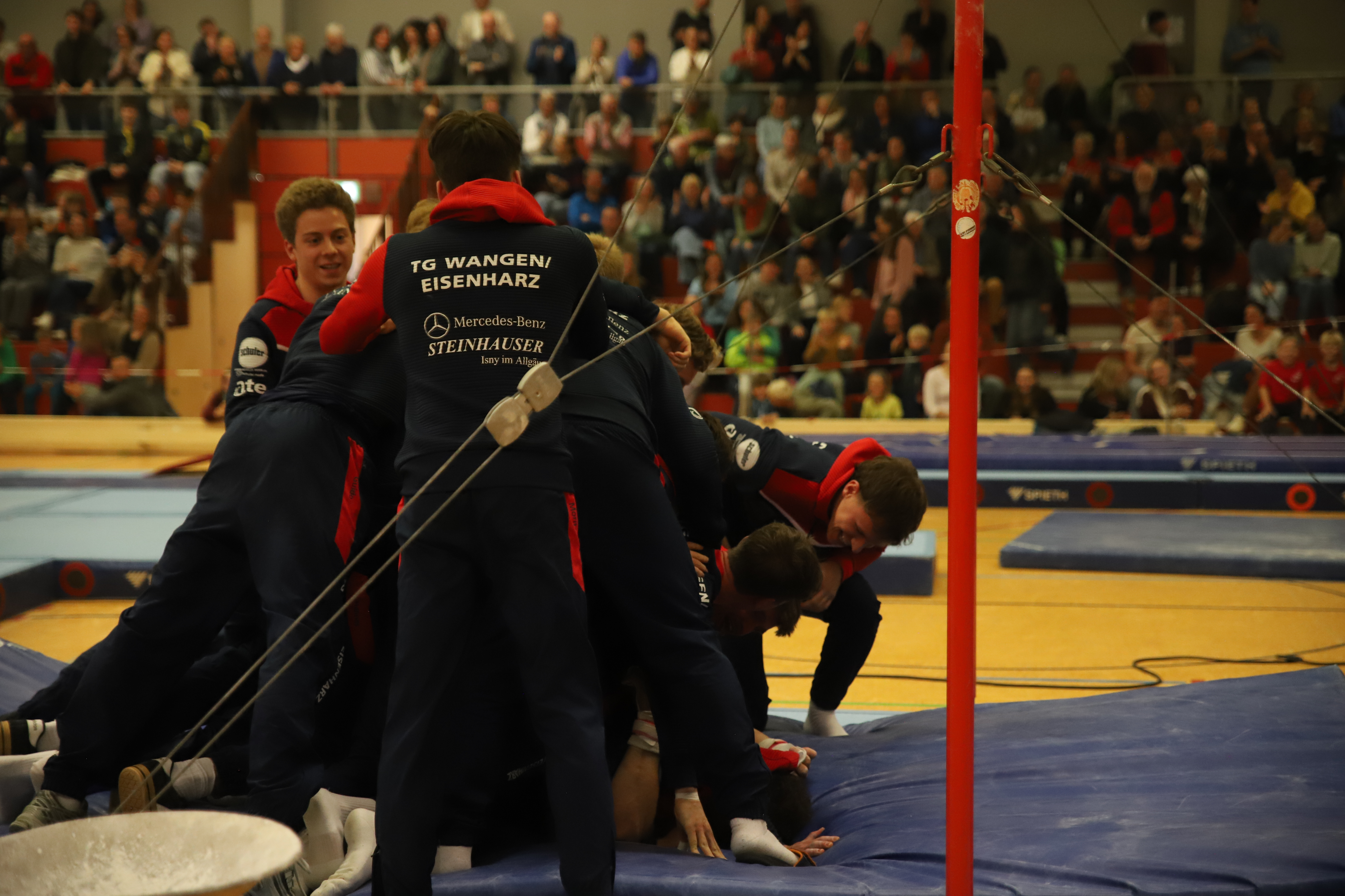 Dort traf zeitgleich die WTG Heckengäu, Tabellenzweiter, auf den TV Schwäbisch Gmünd-Wetzgau 2. Klar war: Nur wenn Wetzgau gewinnt, bleibt der TG-Wangen/Eisenharz die Chance auf Rang zwei – und damit auf den Einzug ins Aufstiegsfinale. Als der Wettkampf in Wangen bereits beendet war, warteten Turner und Zuschauer gebannt auf die Live-Ergebnisse aus Renningen, die auf die große Leinwand übertragen wurden. Vor dem letzten Duell lag die WTG Heckengäu noch mit 37:35 vorne, und die Spannung in der Ebnethalle stieg ins Unermessliche. Dann die erlösende Nachricht nach quälend langer Wartezeit: Yurii Yemelianov holte im letzten Duell vier Scorepunkte für Wetzgau und drehte den Wettkampf. Damit stand der Sieg von Schwäbisch Gmünd-Wetzgau fest – und die TG-Wangen/Eisenharz rückte auf Tabellenplatz zwei vor. In der zum Bersten gefüllten Ebnethalle brach daraufhin grenzenloser Jubel aus. Fans, Zuschauer und Turner feierten gleichermaßen den unerwarteten, aber hochverdienten Einzug ins Aufstiegsfinale. Nun führt der Weg die Allgäuer nach Oberhausen – mit der Chance, sich erstmals einen Platz in der 2. Bundesliga zu erkämpfen.